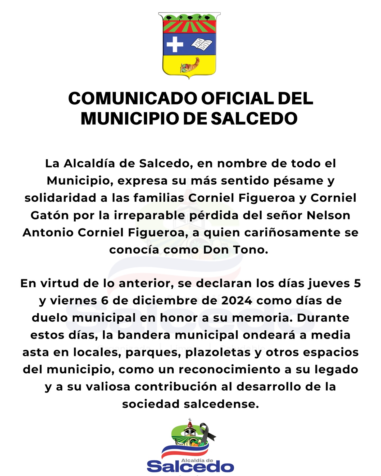 Este comunicado refleja el profundo respeto y reconocimiento que la sociedad salcedense siente hacia el legado de Don Tono, un pilar fundamental en el desarrollo y bienestar de nuestro municipio.